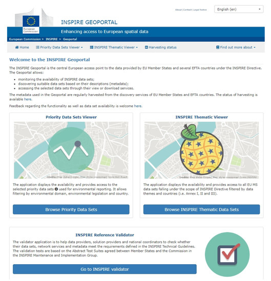 - Minghini, M.; Cetl, V.; Kotsev, A.; Tomas, R.; Lutz, M. INSPIRE: The Entry Point to Europe’s Big Geospatial Data Infrastructure. In Handbook of Big Geospatial Data; Werner, M., Chiang, Y.-Y., Eds.; Springer: Cham, Switzerland, 2021; pp. 619–641. [Google Scholar]