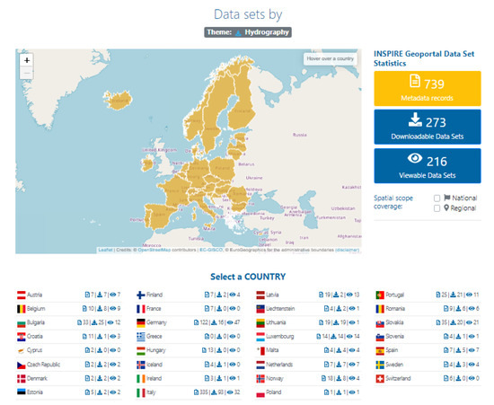 Insight into the current status of the infrastructure is provided by the INSPIRE Thematic Viewer, which offers two possibilities for browsing datasets: by individual EU MS and EFTA countries and by INSPIRE data theme. Figure 6 shows the availability of hydrography datasets in EU MS and EFTA countries as of 3 March 2022.
