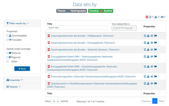 The figure shows the total numbers of metadata records (739), downloadable datasets (273), and viewable datasets (216). It is also possible to filter search results in accordance with spatial coverage (regional or national). At the bottom of the page there is an overview for each MS and EFTA country with individual country results. Again, the first number shows metadata records, the second downloadable datasets and the third is the number of viewable datasets. Click on a particular country, e.g., Austria (Figure 7), provides a more detailed overview for that country.