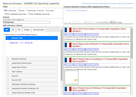 The analysis made within this paper had the aim to investigate and evaluate at what level the obligations stated in the INSPIRE roadmap were fulfilled. Regarding the subject of the special issue of this scientific journal, we focused on two water-related spatial data themes: hydrography and hydrogeology (sub-theme of spatial data theme geology). To be coherent with formal INSPIRE monitoring and reporting, we used several indicators to assess availability and accessibility of hydrography and hydrogeology data (see Section 2.4). The analysis included metadata records available through the INSPIRE Geoportal Thematic Viewer and the resource browser to assess the availability and accessibility of hydrography and hydrogeology datasets. In addition, we investigated view and download services more deeply to compare numbers of declared services on the INSPIRE Geoportal with the ones we could really access through the provided links (URLs).