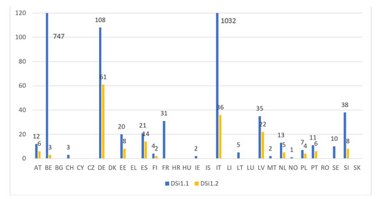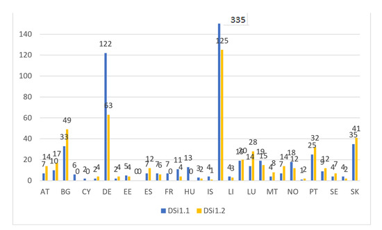 As seen in Figure 9, the mutual relation between the DSi1.1 and the DSi1.2 indicator cannot be described as some predictive pattern. Concerning two of the countries with the largest number of data services available, Germany and Italy, the spatial dataset for which metadata exist (DSi1.1) are significantly larger than the number of the spatial data services with the metadata (DSi1.2), while there is a great number of other countries with this ration in favor of DSi1.2.