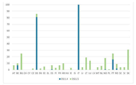 The DSi1.4 and the DSi1.5 are the indicators of the number of spatial datasets that cover regional and national territory, respectively. For the hydrography theme, it was possible to extract these indicators directly from INSPIRE Geoportal. For better insight into all values on the chart, the ordinate axis was limited to 100, despite Italy having 270 DSi1.4 indicator value. The green bar indicates the DSi1.4 national coverage, and the blue bars are indicators of the DSi1.5 regional coverage with spatial datasets. As seen from the Figure 10, most of the countries significantly ‘prevail’ the indicator of the national coverage, while only two countries with the biggest datasets generally available have the regional coverage indicator, the DSi1.5, significantly stronger than the national one.