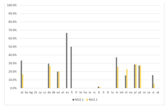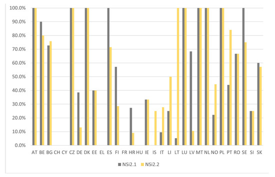 As for the NSi2.1 and NSi2.2 indicators that represent the percentage of spatial datasets that are accessible through view and download services, respectively, Figure 11 shows the high percentage in most of the countries. We noticed curiosity at Germany and Italy, which are the two countries with all other indicators significantly higher than others, but in this case, when it comes to the percentage of really downloadable and viewable data services regarding the declared absolute numbers, their NSi2.1 and NSi2.2 indicators are by far the lower ones.