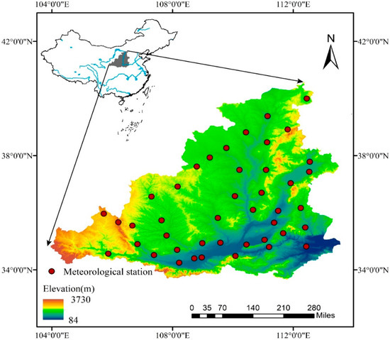 The middle reaches of the Yellow River Basin (MRYRB) are located in the middle of the Loess Plateau within the latitude belt of 32–42° N and the longitude belt of 104–113° E (Figure 1), covering a drainage area of 362,000 km2. The basin spans semi-arid and sub-humid climate zones and is dominated by the continental monsoon climate [25]. The altitude of the region ranges from 84 m to 3730 m, with a distinctively decreasing trend from northwest to southeast (Figure 1). Influenced by the alternation of winter and summer winds and the surrounding terrain, the spatial and temporal distribution of precipitation is hugely uneven. Precipitation in winter and spring accounts for less than 20% of the total annual precipitation and makes up about 70% during the flood season (June to September) [26]. Annual precipitation in the MRYRB exhibits considerable spatial variability, with the overall distribution decreasing from 800 mm in the southeast to 320 mm in the northwest [27,28]. Given the relatively sparse and uneven distribution of the local rainfall-monitoring network, satellite precipitation information plays a positive role in the effectiveness of flood and drought forecasting as a supplement to ground precipitation observations.
