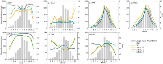 Figure 5 provides a comparison of the monthly variations of the statistical metrics (CC, BIAS, MAE, RMSE, POD, FAR, and CSI) calculated by daily precipitation estimated from the two interpolation methods and the three IMERG SPPs. Meanwhile, intra-annual distribution of precipitation in the MRYRB is displayed as the gray columns in the left axis. Precipitation in the wet season (May–October) makes up about 75% of the total annual precipitation, while the precipitation in winter (December–January) merely accounts for less than 5%. As exhibited in Figure 5a, IDW and OK demonstrate a higher correlation with the gauge-based precipitation than the three IMERG SPPs. Nevertheless, IMERG-F appears to exceed the correlation of interpolated data in the rainiest month (July) in the course of a year. The sharp deterioration in the CC values of the interpolated data in July and August may be due to the fact that the interpolation algorithms hardly describe the specific spatial changes of precipitation. When the rainy season comes, it is difficult for gauge stations in the basin to capture all precipitation that occurs, leading to inaccurate estimation of precipitation. All IMERG SPPs demonstrate similar patterns of CC, with a significant deterioration in the winter season. For instance, IMERG-E provides CC values of 0.22, 0.36, and 0.38 in winter, whereas it provides a value of 0.69 in September. This is probably due to the strong scattering caused by snow cover on mountains in winter, and the light and solid precipitation plays an important role. Light precipitation in summer also has a certain effect on precipitation estimation, but it is not as serious as in winter. Although GPM extends the capabilities of the TRMM sensors to detect light and solid precipitation, snow cover interferes with microwave-based satellites’ ability to distinguish frozen snow surfaces and clouds, reducing the capacity to detect precipitation particles. In terms of BIAS, both IMERG-E and IMERG-L demonstrate remarkable underestimation (31.7% and 31.2%) in January and significant overestimation (140.7% and 92.3%) in December, presenting considerable uncertainties in estimating solid and light precipitation. MAE and RMSE show similar patterns to the intra-annual distribution of precipitation, exhibiting an apparent increase in deviation metrics with the increase in monthly precipitation. Compared with IMERG SPPs, IDW and OK have relatively smaller errors in precipitation estimation.