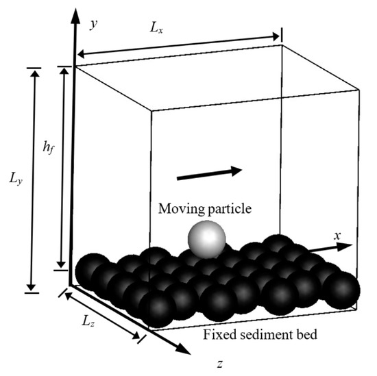 The numerical simulation of sediment particle movement on plane sediment bed in the present study was carried out in a three-dimensional (3D) domain, with the Cartesian coordinates x, y, and z aligned in the streamwise, vertical (upward positive), and spanwise directions, respectively (Figure 1). In order to investigate the different modes of sediment particle movement on the rough bed, a layer of sediment particle was fixed and arranged in a hexagonal lattice in the bottom of the computational domain. The no-slip boundary condition was applied to the bottom of the computational domain; a free-slip rigid lid boundary condition was applied to the top of the fluid domain; and periodic boundary conditions were imposed in the upstream, downstream, and cross-stream sides of the computational domain. Considering the large amount of computation costs, and the periodic boundary conditions of the streamwise and lateral side in the model, the streamwise, vertical, and spanwise length of the computational domain were set as 42 3 d, 15 d, and 18 d, respectively. The setup of the numerical model was based on the setup of other similar numerical models, which is that the width of the computational domain is slightly larger than the height [53].