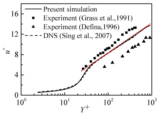 The mean streamwise velocity profile normalized with the bed shear velocity u is presented in Figure 2. Y + is the normalized effective height ( y y b ) u / ν , y b is the effective location of the bed, which is normally estimated by fitting the mean velocity curve to the logarithmic law-of-the-wall region. Grass et al. [55], Defina [56], and Singh et al. [45] determined equivalent sand roughness ks = 79.2, 288, and 102 by fitting mean velocity profiles to the logarithmic law-of-the-wall. Using a similar approach, equivalent sand roughness ks was equal to 110 in the present study. Through a comparison with the experimental results of Defina [56] and Grass et al. [57], it is indicated that the flow profile followed the standard pattern of velocity defect increasing with wall roughness.