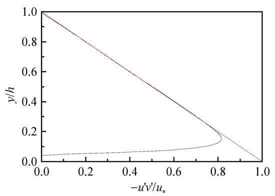 Figure 3. Reynolds shear stress normalized by the bed shear velocity. The black solid line represents Reynolds shear stress u ' v ' / u 2 on the rough bed; the red solid line represents total shear stress on the smooth bed.