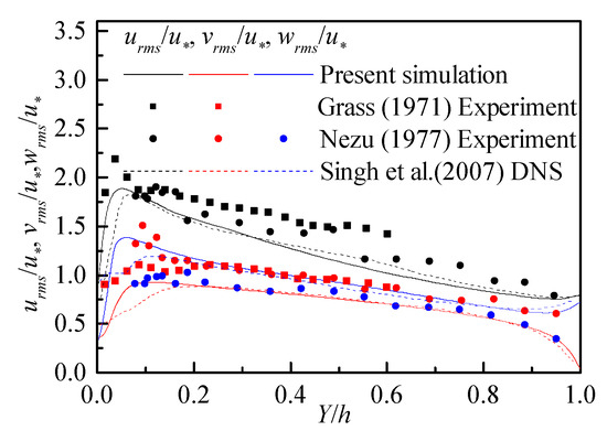 The turbulence intensities normalized by the bed shear velocity are shown in Figure 4, together with the experimental results from Grass [57] and Nezu [58], and the numerical simulation results from Singh et al. [45]. The simulated turbulence intensities in three directions are also in good agreement with both experimental and DNS data.