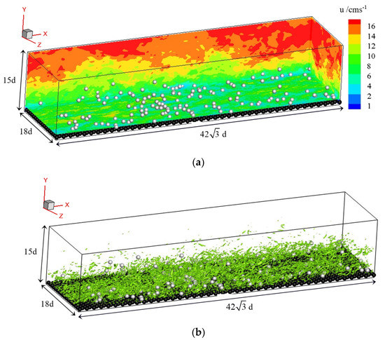 Figure 5. Instantaneous velocity and vorticity fields of the flow and particle distribution. The black particles are bed; the gray particles are the moving sediment particles. (a) Instantaneous contours of the streamwise velocity and the particle distribution. (b) Instantaneous vortical structures and the particle distribution. The blue iso-surface indicates the vortical structure, Q = 12,000, which is the second invariant of the velocity gradient tensor.