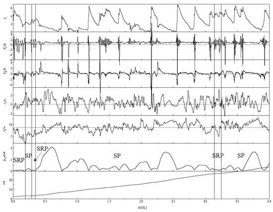 Figure 6 presents the typical continuous trajectories and dynamic behaviors of individual particle movement and the corresponding hydrodynamic forces exerted on sediment particles with a resolution of 0.00005 s. From the trajectory variations of sediment particle movement, it clearly indicates that a sediment particle moves forward in the mode of sliding or rolling and saltation; the different motion modes are intermittent with time. From the variation of the dynamic responses of sediment particle movement, it indicates that the streamwise and vertical velocity of the particle are disturbed under the instantaneous impulses of hydrodynamic forces during coherent structures. From the variations of the hydrodynamic forces exerted on sediment particles, it shows that the hydrodynamic forces of the moving particle present relatively obvious changes during the process of the moving particle’s contact with the bed. At the moment of sediment particle saltation, the absolute value of the drag force increases drastically then decreases gradually. The lift force plays a more important role than the drag force in the saltation process. Particle rotation is mainly controlled by the particle’s collisions with the bed. From the variation of the particle’s angular velocity (the clockwise rotation along the z direction is positive), when the particle collides with the fixed particle, the particle’s takeoff angular velocity is obviously larger than the particle’s incidence angular velocity, and the particle’s angular velocity increases drastically and reaches the maximum value, then decreases gradually owing to the viscous effects.