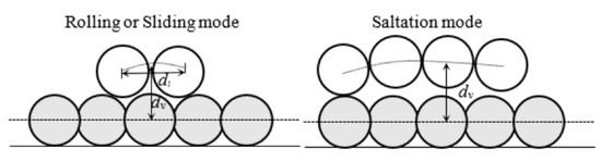 There are two main ways of describing sediment particles, namely, the distinct element method (DEM) and finite element method (FEM/DEM). The DEM is becoming widely used in simulating granular flows. In recent years, the coupling of computational fluid dynamics (CFD) and DEM has been rapidly developed since this method was first applied to studying the macroscopic properties of particulate matter by Cundall and Strack [26]. The contact forces of particles such as normal and tangential force are calculated based on the Hertz–Mindlin–Deresiewicz theories [27], and the interaction forces between the fluid and particle are calculated by the empirical formula or immersed boundary method [28]. The CFD and DEM coupling method has been used to simulate the movement of the sediment particle [29,30,31,32,33,34] and ripple evolution [35,36,37,38,39] under the turbulent flow. The other developments in DEM are the combination of FEM and DEM, which was developed by Munjiza [40]. Important advantages over DEM models based on spheres, ellipsoids, or even superquadrics are that complex particle shapes can be introduced in the combined FEM/DEM. Furthermore, a vast range of alternative, e.g., nonlinear constitutive or internally fracturing properties can be introduced for the individual particles [41]. Ji et al. [42,43] used the combined FEM/DEM method to simulate bed load movement within two–three layers of densely packed spheres under the turbulent flow, and investigated the particle entrainment and saltation process, and analyzed hydrodynamic forces exerted upon the particle at the threshold value or the low flow intensity. However, the characteristics of the different modes of bed load movement (sliding or rolling and saltation) have not been analyzed. Exploring the mechanism of different movement modes of a sediment particle is helpful to further understand the movement process of bed load sediment.