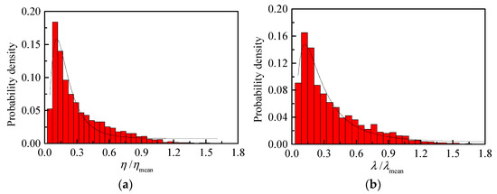 Figure 8. Probability density distributions of dimensionless saltation length and saltation height. (a) Saltation length. (b) Saltation height.