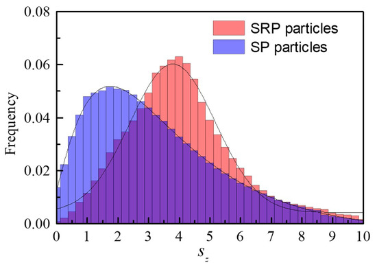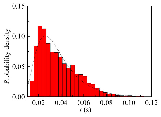 In this study, the saltation height and length, and incidence and takeoff angle of the saltation sediment are studied and compared with the experimental results. Figure 8 shows the probability density distributions of dimensionless saltation length and height for SP. It is indicated that the dimensionless saltation length and height both follow the Γ function distribution, which is similar to the distribution pattern of the experimental results [15]. The distribution pattern is mainly related to the velocity fluctuations of the flow and the bed roughness. Lu and Willmarth [63] pointed out sediment particle saltation mainly occurs during sweeps (fourth quadrant) and outward interactions (first quadrant), while saltation is almost negligible during ejections (second quadrant) and inward interactions (third quadrant) in the quadrant events under the action of turbulent structures. Furthermore, the collisions between saltation particles increase the saltation length and height, as can be seen in Figure 9. Similarly, the collisions between saltation particles increase the probability of a larger flight time and cause the flight time following the logarithmic normal distribution, as can be seen in Figure 10.