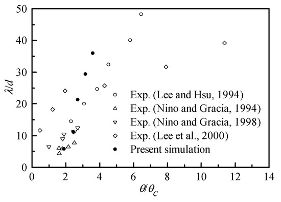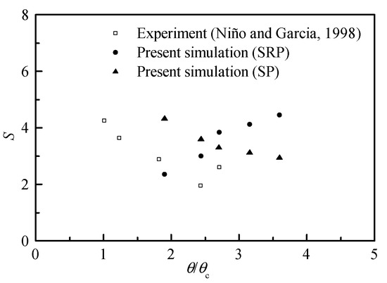 A comparison of the dimensionless saltation length between the present simulated results and experimental results is plotted in Figure 11. It indicates that dimensionless saltation length increases as the transport stage increases. At the lower transport stage, the simulated results of dimensionless saltation length are very close to the experimental results [9,17], which verify the correctness of the numerical model. At the medium transport stage, the simulated results are larger than the experimental results. Einstein and El-Sammi [64] pointed out that saltation length is affected by particle size and shape; their opinions are verified by the experiment of Lee et al. [18] at the low flow intensity, in which they pointed out that at the low flow intensity, the dimensionless saltation length and height increase with the particle diameter. Amir et al. [65] believed that the maximum saltation height increases with the increase of the flow depth and particle density. At the medium transport stage, the simulated results are larger than the experimental results. The reason may be that the moving sediment particles collide with each other under the turbulent flow structure, and the inter-particle collisions increase the saltation length, as can be seen in Figure 9. Lee et al. [66] investigated the inter-particle collision behaviors during the saltating process of multiple particles, and found that the maximum saltation height was about 2–2.5 times the values calculated by a single-particle saltation. It is also verified that the trajectories of saltation particles due to inter-particle collision has multiple peak positions, which are clearly different from the typical trajectory of single-particle saltation.