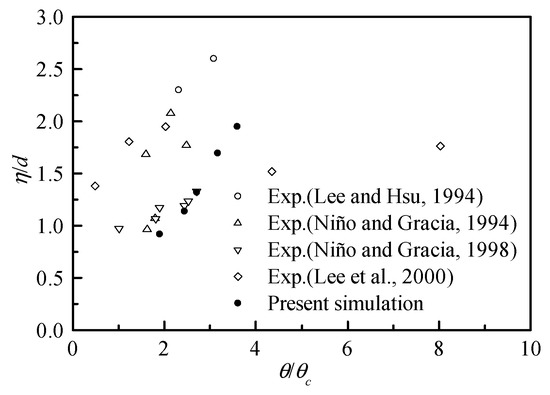 Figure 12 presents a comparison of the dimensionless saltation height between the present simulated results and the experimental results. It is found that the dimensionless saltation height increases with the increase of the transport stage. At the low transport stage, the dimensionless saltation height is in good agreement with the experimental results by Niño and García [9,17]. Similar to the saltation length, the difference of saltation height between the present simulated results and experimental results at the medium transport stage may be induced by the inter-particle collision, particle size, and flow depth. Moreover, Auel et al. [61] indicated that for a given transport stage, the saltation height for a mild bed slope is larger than that for a steep slope, and the differences reduce with the increase of the transport stage.