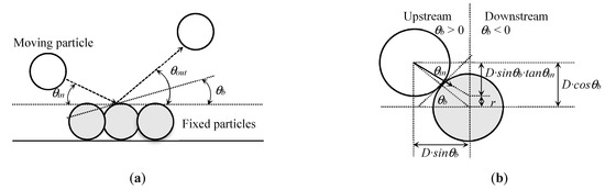 The sediment particles under the action of turbulent flow collide with the bed, and three important collision angles are used to characterize the saltation process, i.e., incidence angle θ i n , takeoff angle θ o u t , and collision position angle θ b as shown in Figure 13. The angles of incidence θ i n and takeoff θ o u t are defined with respect to a line parallel to the channel bottom, and they are calculated through the particle trajectory right before and after the collision [33]. The collision position angle θ b is the angle between the tangential collision surface and the bed bottom. Based on the magnitude of the collision position angle, the collision point is located on the upstream ( θ b > 0) and downstream faces ( θ b < 0) of the bed particle. In this study, the analysis on the incidence angle θ i n and takeoff angle θ o u t are presented. The results on the collision position angle θ b involve the analysis of the “splash function”, which will be studied in future research work.