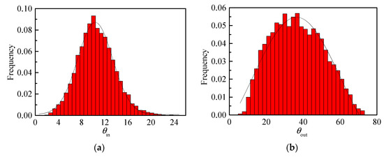 Figure 14. Frequency distributions of incidence angle θ i n and takeoff angle θ o u t . (a) Incidence angle. (b) Takeoff angle.