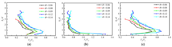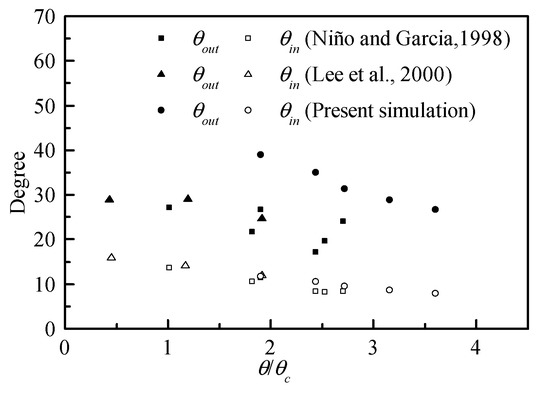 The particle’s incidence angles θin and takeoff angles θout change due to the combined interaction of lift and drag forces and the submerged weight under different flow intensities. Figure 15 presents the variation of incidence angles and takeoff angles with the transport stage. It indicates that the incidence and takeoff angles decrease with the increase of flow intensity. This is related to the relative magnitude of the drag and lift forces (Figure 16c). It also indicates that the present simulated results of incidence angles agree with the experimental results, but the takeoff angles are larger than the experimental results [9,18]. The reason may be related to the arrangement of bed and water depth.