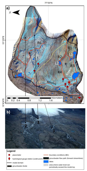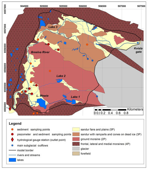 - The model’s results indicate the existence of a groundwater divide in the central part of the foreland, i.e., that there are two subsystems of shallow northern and southern groundwater circulations. From the north and north-eastern zones, groundwater flows westwards towards the Breelva channel and south-westwards along the end moraine direction to the single gauging point on its southern margin. In the southern part of the basin, groundwater flows towards smaller rivers and lakes, especially Lake Mewie, which drains a significant proportion of the groundwater aquifer. Finally, groundwater also flows in a south-westerly direction towards the Breelva gauge.