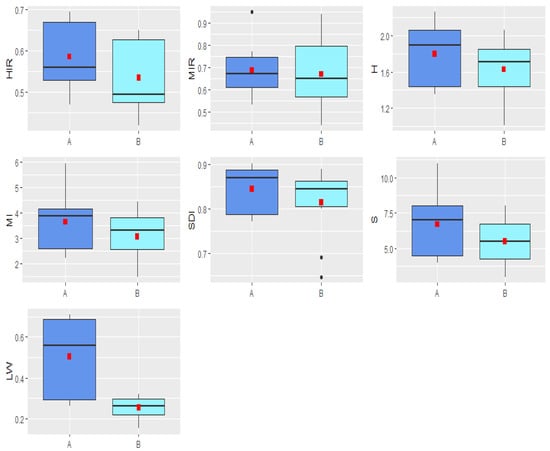 Box plots for the analyzed indicators. The box represents the first and third quartiles. The horizontal line across the central region of the box represents the median. A red square marks the mean value of the data. The whiskers are drawn to the most extreme observations located no more than 1.5 times the interquartile range away from the box. Any observation not included between the whiskers is considered an outlier and is plotted with a black dot. The whiskers indicate the minimum and maximum values when there are no outliers. A–habitat type A; B–habitat type B.