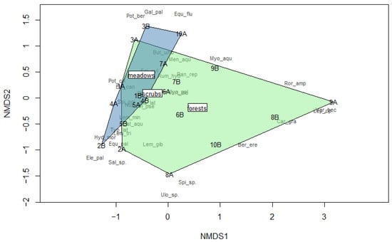 Non-metric multidimensional scaling (NMDS) was conducted to examine the relationship between species composition with HIR and WL, assessing Bray–Curtis dissimilarity. We performed the NMDS using the metaMDS function of the ‘vegan’ package [34] in the R environment.