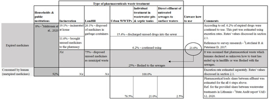 - Public institutions and households. All the establishments that are not directly related to therapeutic activities can be attributed to the source of public institutions and households. The effluence of the pharmaceutical substances analyzed may occur in places such as retirement homes for the elderly, boarding houses or prisons. For this research, it was assumed that unused medicines makes up approximately 8% [27]. The remaining 92% was assumed to be consumed and excreted through urine and feaces. See Figure 5 for the matrix of the loads estimated in households. The matrix defines only the output data from public institutions and households. Based on the literature analysis [25,28], consumers dispose of expired medicines in a few typical ways: they incinerate them at home, bring them to the pharmacies, dispose of them as municipal waste, continue using them or discharge them into the sewer systems; 21.6% were unaware of how to treat them. All of the sections in Figure 5 make up 100% (defined by the orange square). The schema shows that in the group of the 21.6% who were unaware of how to dispose of the waste, it is assumed that 75% of the unused medicines were disposed of as municipal waste and 25% flushed away into the sewage system. Moreover, all discharges to the wastewaters based on most typical wastewater treatments in Lithuania [28] were separated into urban WWTPs, individual treatment in wastewater pits and septic tanks, or direct effluents to surface waters. These three different types of treatments were used as the main approach for the expired and consumed medicine load calculations.