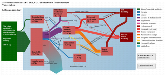 - Health institution sector and hospitals. According to the VVKT data, 26.74 kg (i.e., 3.8% of totally consumed macrolides) of macrolide antibiotics was sold directly for the health institution sector. According to the latest available data within the country, only a small portion of medicines remain unused in hospitals [25]. It was assumed that only 5% of medicines were exposed to hazardous waste management equipment due to expired date or improper storage of medicines, while the remaining 95% were consumed by patients. A total of 33% of the total target macrolide antibiotics that entered the health institution sector were released in an active form by excretion in faeces and urine and ended up in sewage collection networks (see Section 2.1. for the excretion rates) [26].
