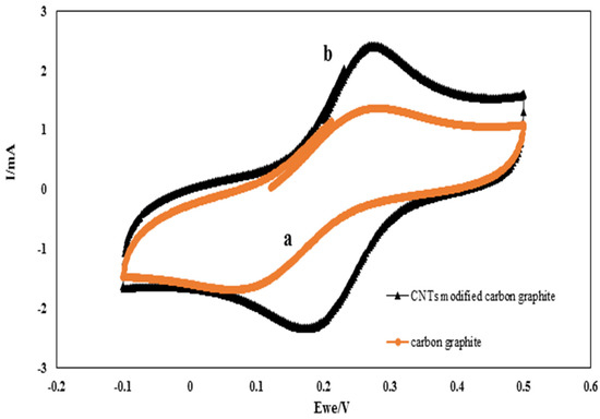 Cyclic Voltammetry (CV) was used to analyze the electrochemical characteristics of CNT-modified graphite electrodes. Figure 2 shows the CV response of the carbon graphite electrode in comparison with those of the CNT-modified carbon graphite electrode. Using CNTs as the electrode coating markedly increased the peak current of CV (curve b). It can be seen from the CNT-modified graphite curve (curve b) that the peak current is much higher and the horizontal interval between the anodic and cathodic peak potentials (∆Ep) is smaller than those of the carbon graphite curve (curve a). The results show the significance of CNT nanoparticles in improving the electroactive surface area. Therefore, CNT-modified carbon graphite electrodes appear to be more effective in dye decolorization compared to carbon graphite electrodes.
