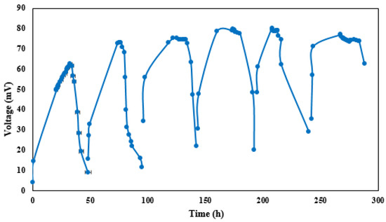The time course of the voltage was recorded after synthetic wastewater was added to the anode compartment of the MFC including anaerobic sludge. Figure 3 shows the first six cycles of the tests with an unmodified carbon graphite bar used as the cathode electrode. During the first cycle, the open-circuit voltage increased to 64 mV during the start-up and remained unchanged for a few hours before gradually decreasing to a minimum value due to the lack of nutrients needed for microbial growth and metabolism. Furthermore, nearly constant maximum voltage values were observed from the fourth cycle to the fifth, which indicated the appropriate biofilm formation on the anode surface in order to start the tests [6]. Figure 4 shows the time course of the voltage and current density at an external resistance of 1 kΩ as well as the COD removal of the substrate during a fed-batch cycle. The results show a maximum voltage production of 80.3 mV only three hours after the initiation of the experiment; it lasted about eight hours due to the proportionality of the substrate consumption rate and voltage production and then revealed a sudden drop in voltage (to 22 mV), coinciding with an 82.3% COD removal efficiency (COD decreased to a value of 86.5 mg/L) at the end of the cycle (48 h). This was also observed by Kloch and Toczyłowska-Mamińska (2020) [47], where the highest COD removal (>94%) was achieved at an external resistance of 1 kΩ; however, this occurred over a longer period of time (after 20 days). The same pattern was investigated for current density variations during the cycle. Thirty-seven percent of the initial COD was removed during the first 11 h of the cycle, indicating that the maximum MFC performance occurred within the time between the beginning of the operation and the end of the system’s stable mode [47]. In contrast, at an external resistance of 300 Ω, ca. 95% COD was removed from brewery wastewater using a sequential anode–cathode MCF with only a 14 h hydraulic retention time [48].