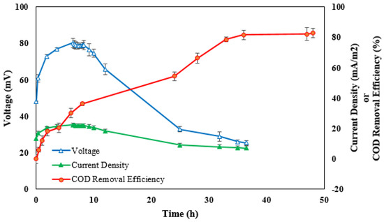 COD removal efficiency, voltage, and current density during a fed-batch cycle (external resistance = 1 kΩ).