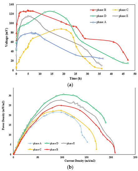 Maximum voltages of 80 and 120 mV and maximum power densities of 22 and 25 mW/m3 were observed during phases A and B (as shown in Figure 5), respectively, which could be due to the increased specific surface area of the cathode and greater access of the catholyte solution to reduce oxygen in water molecules. As a result, more transitions were transferred from the anode to the cathode compartment, while the produced voltage and power density increased. The maximum voltage and power density produced during phase B (128 mV and 25 mW/m3, respectively) decreased to 88 mV and 23.3 mW/m3, respectively, during phase C, which is irreconcilable with the other studies [49,50]. Bakhshian et al. [10] found that the power density obtained during phase B should be lower than the one produced during phase C. In the same vein, the remarkable differences in power density values between the current work and the literature may be because of the type of electrode used. For instance, CNTs and modified carbon graphite electrodes resulted in lower power generation when compared with the carbon brush electrode [49]. Furthermore, according to Savizi et al. [5], the maximum power density obtained in the presence of dye is lower than that observed in the absence of dye (using the carbon graphite bar as the cathode), which indicates that the RB221 dye decreased the MFC performance due to the electrode surface being covered with dye (surface adsorption), the oxidation of the dye, or the decomposition of intermediate compounds. Bakhshian et al. [10] studied RB221 byproducts and verified that a reduction in byproducts results in enhanced power production. In this study, the adsorption experiment showed a 14.3% reduction in dye concentration, which indicates that dye adsorption on the electrode surface could result in lower power production.