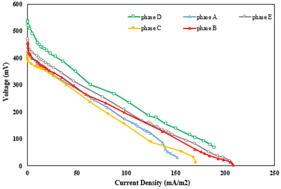As shown in Figure 5a, the maximum voltage recorded during phase D (124.1 mV) was a bit lower than that obtained during phase B (128 mV). The slow enzyme activity in electron conveyance and its lower contact surface area compared to CNTs are possible reasons for this difference. Although the power density increased from 25 mW/m3 during phase B to 32 mW/m3 during phase D (Figure 5b), according to Savizi et al. [5], the laccase enzyme effectively reduces electron loss while transferring from the anode to the cathode compartment. The maximum voltage of 128 mV during phase B decreased to 115 mV during phase E. This decline could result from the adsorption of dye molecules on the cathode surface, as well as the low electron transfer activity and low contact surface area of the laccase enzyme. However, the maximum power density of 25 mW/m3 observed during phase B increased to a value of 27.6 mW/m3 during phase E, which is lower than that in a previous experiment [50]. The rise in the power density in phase E is due to the fact that the laccase enzyme is a catalyst for oxygen reduction and dye decolorization [10]. The polarization curves relate to all phases, as shown in Figure 6. It can be perceived that using CNTs as an electrode coating in the cathode chamber containing a buffer solution as a catholyte reduces the system’s internal resistance. In addition, the internal resistance of the MFC decreases more efficiently when utilizing a CNT-modified cathode in a buffer solution including the laccase enzyme.