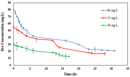 Free laccase was used to study the MFC performance in the enzymatic decolorization of RB221. A carbon graphite electrode modified with CNTs was used as the cathode chamber electrode. Initial concentrations of 30, 55, and 80 mg/L were determined in order to study enzymatic decolorization in the system’s cathode compartment. Synthetic wastewater with an initial COD of 500 mg/L was fed to the sludge in the anode chamber, and the dye and laccase were both dissolved in a buffer solution in the cathode compartment. The time course of the removal of the dye was recorded through three test cycles (each 48 h) at different initial dye concentrations, and then the mean results were recorded (Figure 7). After five hours, decolorization efficiencies of 23.3%, 27.3%, and 43.7% were observed for initial dye concentrations of 30, 55, and 80 mg/L. Maximum decolorization efficiencies of 58.7%, 69.4%, and 73.4% were also obtained after 15, 25, and 32 h when using initial dye concentrations of 30, 55, and 80 mg/L.