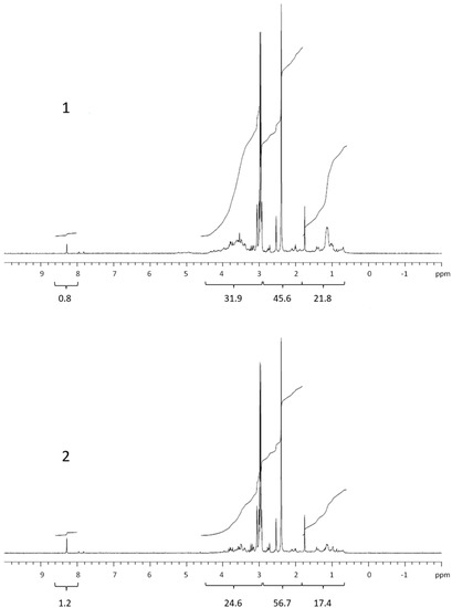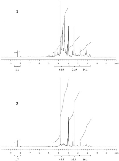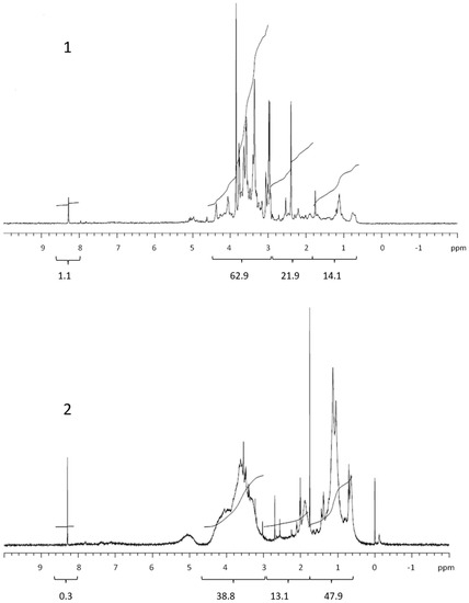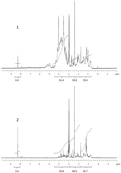 1H NMR spectra of retentate (1) and permeate (2) isolated from exudate of the nanoflagellate Teratselmis marina. Values below brackets are integrated values.