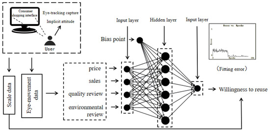 To determine the correlation between price, sales, quality reviews, environmental reviews, and the purchase intention of reclaimed water and to predict and analyze it, this study constructed a BP artificial neural network to achieve its representation data fitting and it standardizes the independent variable fixation time and the dependent variable purchase intention. The loss function in Formula (1) was used to feed the error back. Eighty percent of the total data was used as the training set, and 20% was used as the test set. By continuously adjusting the learning rate and thresholds of deviation points as well as the initial range of weights among the points, the error in the training set converged and worked well (Figure 1), and the correct fitting rate of the test set was higher than 70%, and the prediction results were acceptable. To further refine the correlation analysis, a mixed OLS regression analysis using Stata revealed that the p > |t| value for price on the intention to reuse recycled water was 0.2 over 0.1, and the correlation was insignificant. Therefore, in the subsequent study, the impact of three factors on the intention to reuse recycled water, namely, sales, quality reviews and environmental reviews, was investigated.