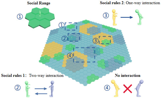 Social rule 2: Subject A finds Subject B within the social scope, but Subject A does not have a one-way interaction within the social scope of Subject B (A vs. B). ① If the influence of A is less than that of B, A cannot influence B. ② If the influence of A is more significant than that of B, then A influence B.