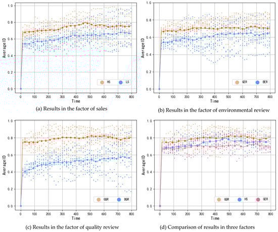 As seen from Figure 3a, only adjusting for the sales factor, the average intention to reuse recycled water after group interaction in the high-sales situation was 0.744, while in the low-sales situation, the average reuse intention was 0.667, and the average recycling level intention to reuse recycled water increased by 11.5% in the high-sales situation compared to the low-sales situation. The result proves that sales have a significant impact on the public’s intention to purchase recycled water. As seen in Figure 3b, adjusting only for the environmental reviews factor, the average intention to reuse recycled water after group interaction in the good environmental review situation was 0.711, while the average intention to reuse recycled water in the bad environmental review situation was 0.655. The average intention to reuse recycled water in the positive environmental review situation increases by approximately 8.5% compared to the negative environmental review situation, demonstrating that there is an effect of environmental reviews on the public’s intention to reuse recycled water. As seen in Figure 3c, adjusting only for the quality review factor, the average intention to reuse recycled water after the group interaction was 0.814 in the good quality situation compared to 0.565 in the bad quality situation, an increase of approximately 44.1%, thus demonstrating that the change in the good quality reviews had a significant impact on the public’s intention to reuse recycled water. The effect of the change in quality rating on the public’s intention to reuse recycled water is substantial.