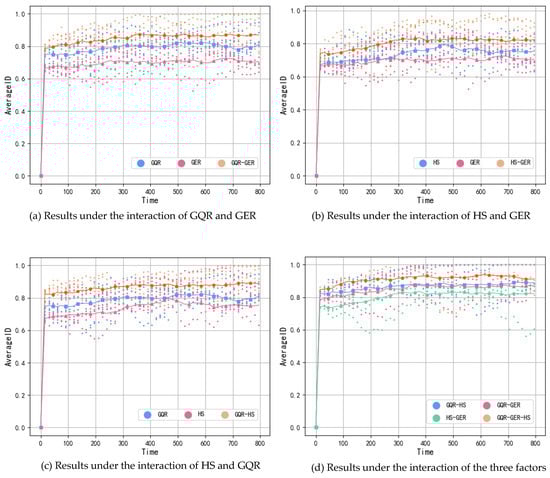 As seen in Figure 4a, the group’s average intention to reuse recycled water obtained from the simulation in the good quality reviews–good environmental reviews situation reached 0.868, which was approximately 22.1% and 6.6% higher than the group’s average intention to reuse recycled water in the single-factor situations of good environmental reviews and good quality reviews, respectively. As seen in Figure 4b, the group’s average intention to reuse recycled water obtained after simulation in the high sales—good environmental reviews situation reaches 0.822, which was approximately 15.6% and 10.5% higher than the group’s average intention to reuse recycled water in the good environmental reviews and high sales one-factor situations, respectively. The result indicates that the public’s intention to reuse recycled water has increased better in this two-factor situation compared to the separate single-factor situations. As seen in Figure 4c, the average group recycled water reuse intention obtained from the simulation in the good quality reviews–high sales situation was 0.893, which was an increase of approximately 9.7% and 20.0% compared to the average recycled water reuse intention of the group in the one-factor situations of good quality and high sales. The results indicate that the public’s intention to reuse recycled water increased somewhat in the good quality reviews–high sales situation compared to both single-factor situations.