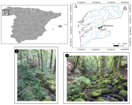 This study was conducted in two second order streams minimally impaired by human pressures located in the Pontevedra province (Galicia, NW Spain) during summer 2020: As Murteiras (42°20′43.8″ N, 8°23′6.4″ W) and Ventín streams (42°19′29″ N, 8°26′21.1″ W) (Figure 1). Both streams were selected among the headwaters of the Oitavén River, basins of Atlantic forest with streams having riparian and basin vegetation dominated by birch (Betula alba L.), oak (Quercus robur L.), accompanied in the forest floor with blueberries (Vaccinium myrtillus L.). This location in the northwest corner of the Iberian Peninsula exposes Galicia to the direct influence of the Atlantic Ocean. Therefore, the area is characterised by rainy weather (annual precipitation around 1500 mm) of relatively constant year-round precipitation frequency, with mild temperatures (around 8.5 °C in winter and 19 °C in summer). The most abundant bedrock materials are granite and mica schist [43], being the studied streams of slightly acid waters, with low salt and nutrient content [44,45].
