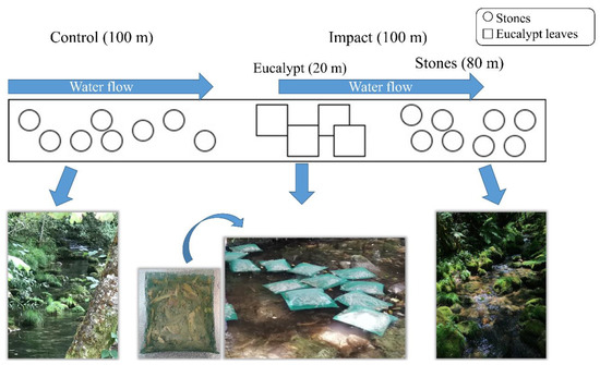 To elaborate the bags containing eucalypt leaves, freshly fallen eucalypt leaves from a plantation located 40 km from the study area were collected from the most superficial layer of the soil. In the laboratory, they were dried at room temperature and in the dark, to avoid phenol degradation [46], and then we estimated the leaves’ wet weight and Ash Free Dry Mass (AFDM). The percentage of humidity of several fractions of eucalypt leaves (i.e., 14.2–15.3%) was estimated to discount it in the estimation of dry weights to be used in each stream. The quantity of eucalypt leaves used to build the bags deposited on each stream was derived from existing values of benthic amounts of eucalypt leaves in streams affected by eucalypt forestry under low-flow conditions (267.0 g AFDM m−2; [11], multiplied by the area of each impacted reach (mean channel width of the streams throughout the experiment was 1.0 m2 at As Murteiras and 1.5 m2 at Ventín), this area being influenced by the eucalypt leachates from the bags located in the upstream end. Next, the eucalypt leaves were wrapped in mesh net bags (5 mm mesh size) of 1 kg and deposited on the stream bed within the first 20 m of the upstream end of the impacted reach of both streams (Figure 2). The impacted area comprised thus 80 m2 in both streams, which corresponded to 26 kg of eucalypt leaves wet weight in As Murteiras and to 40 kg wet weight in Ventín stream. According to the calculations based on Canhoto and Laranjeira [41], the quantity of phenols from eucalypt leachates released during 7 days was 2328.3 mg mL−1 in As Murteiras and 3582.0 mg mL−1 in the Ventín stream. Although in the case of this study, the leachates are diluted with the discharge.