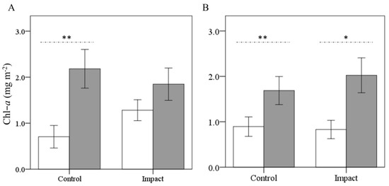 In the before period, Chl-a concentrations were initially similar in both streams (Figure 3). In As Murteiras, mean Chl-a levels significantly tripled their value at the control reach in the ‘after’ period (0.7 to 2.2 mg m−2; Wilcoxon test, p = 0.01), while at the impact reach the increase was low and non-significant (1.3 to 1.8 mg m−2; p = 0.14) despite having higher initial concentrations (Figure 3A). However, in Ventín Chl-a significantly increased at control (0.9 to 1.7 mg m−2; p = 0.01) and impact reach (0.8 to 2.0 mg m−2; p = 0.04) (Figure 3B). In Ventín, significant differences were already found in Chl-a levels between the second and third week at the control reach (Wilcoxon test, p = 0.04).