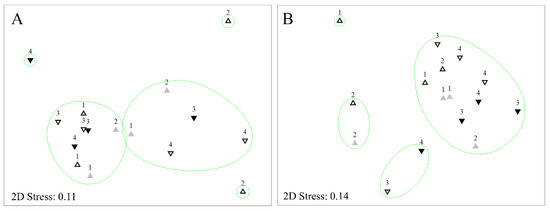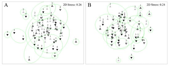 Non-metric Multi Dimensional Scaling (nMDS) analysis of As Murteiras (A) and Ventín (B) benthic diatom samples during the experiment. Numbers representing collection week (1, 2 before collections and 3, 4 after collections). Samples were differentiated by symbol and colour: Control before (open up-triangle), control after (open down-triangle), impact before (grey up-triangle), and impact after (black down-triangle). Clustering at 60% (green circle).