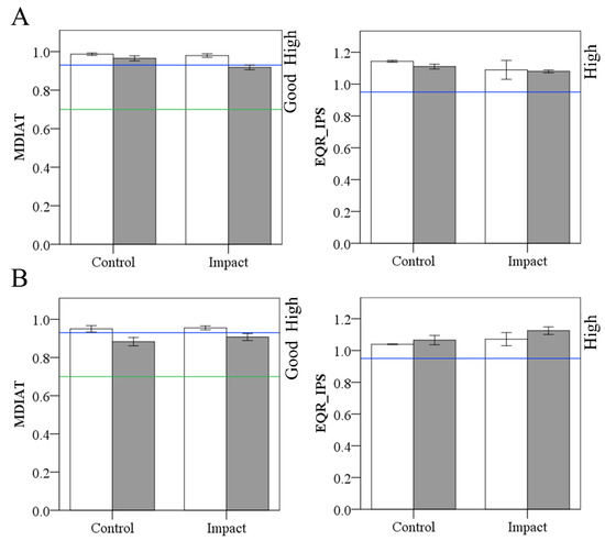Diatom indices values measured before (white bars) and after (grey bars) the eucalypt addition in As Murteiras (A) and Ventín (B). Lines on Y axis representing the ecological status boundaries: blue line, high ecological status; and green line, good ecological status. Error bars represent ±1 SE.