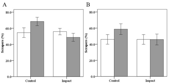 Changes in the average percentage of scrapers at control and impact reaches of As Murteiras (A) and Ventín (B) before (white bar) and after (grey bar) the eucalypt addition. Error bars represent ±1 SE.