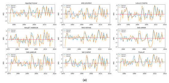 This step was carried out to evaluate whether the trained ML models are generalizable in order to predict the annual SPEI for the dataset unseen during the training phase. To that end, we simulated the annual SPEI with 20% of the original dataset and evaluated the model performances. Table 7 presents the models’ performances during the validation phase. It was observed that, except for ANN_Sep, ANN_Oct, and ANN_Nov, all other models presented good accuracy during the validation phase, with an NSE ranging from 0.62 to 0.99, an R2 ranging from 0.62 to 0.99, and an RMSE ranging from 0.07 to 0.58. Such accuracy predictions were found by [34] in predicting the standardized runoff index (SRI) in Algeria.