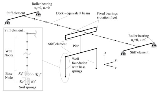 A schematic representation of the model is presented in Figure 5. Each bridge member is modelled with linear elastic Timoshenko beam-column elements. The load transfer between individual beam elements is achieved by the definition of fictitious infinitely stiff and weightless elements (stiff elements), which are used to connect the centroid lines of the elements. A more precise distribution of the forces in the bearing at the abutments and the middle pier is gained by positioning the bearing at their actual location in plan and elevation using rigid elements (see Figure 5). The deck of the bridge is modelled with an equivalent beam element. The boundary conditions at the abutments simulate the roller bearings’ behavior (i.e., free translation in the longitudinal direction and free rotations). The bearings at the pier are modelled as pinned.
