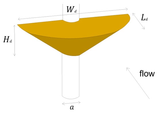 , , and are the width, height, and length of the debris accumulations, respectively (see Figure 6). is the debris Froude number, is the gravitational acceleration, and is the so-called key log length. The key log is the key element that triggers the accumulation of debris on the pier of the bridge and is represented by the longest wood debris that can be encountered in the upstream reach of the river [48]. In contrast to the recommendation of the Australian standard, the shape of the debris mat is not rectangular but resembles a half-cone pointing downward (see Figure 6). In addition, the size of the debris accumulation depends on the flow velocity.
