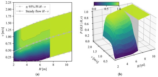 Results obtained from the numerical simulations of two flooding events. (a) Relation between water height () and discharge (); (b) relation between water velocity () and water height (). The steady flow relationship and the 95% prediction interval curves are also represented.