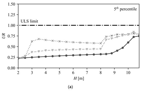 As indicated in the literature ([24,25,46,47]), the distribution of the hydrodynamic forces over the water height can be well approximated by a triangular shape. The triangular distribution of the forces yields a lower safety margin than a uniform distribution because it results in a larger overturning moment above the base of the foundation.